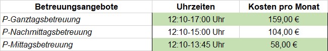 Hier die aktuellen Preise für die verschiedenen Betreuungsmodule.