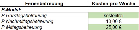 Das Angebot der Ferienbetreuung richtet sich an alle Kinder unserer Schulbetreuung. Die Teilnahme an der Ferienbetreuung ist kostenpflichtig und bedarf einer verbindlichen Anmeldung. Diese erhalten die Eltern etwa 4 Wochen im Voraus zusammen mit den geplanten Aktivitäten und Ausflügen per Mail. Die Anmeldung muss der Einrichtung bis zum im Infobrief angegebenen Anmeldeschluss vorliegen. Für die angebotenen Aktionen und Ausflüge fallen zusätzliche Geldbeträge an, die den Eltern nachträglich in Rechnung gestellt werden.